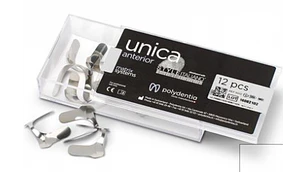 Única anterior es la matriz ideal para realizar restauraciones directas de cavidades de clase III, IV, V, y restauraciones estéticas como carillas de composite de estratificación directa y modificaciones de forma de los incisivos centrales maxilares.